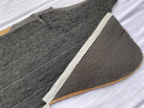 Welche Einlage die passende ist, hat bei mir für viel Grübeleien gesorgt. Da Webpelz nicht gebügelt werden kann, sieht die Nähanleitung nicht-klebende Einlage vor, die aufgenäht werden muss, und für alle möglichen Nähte, die verstärkt werden müssen, Webband, das ebenfalls aufgenäht werden muss. Außerdem wird der Futterstoff noch mit einer wärmenden Innenschicht gedoppelt. In der Anleitung gehen für diese diversen Innenschichten die Begriffe interlacing, interfacing und interlining munter durcheinander, das ist reichlich verwirrend. Aber es gibt viele Fotos, die viel zum Verständnis helfen.