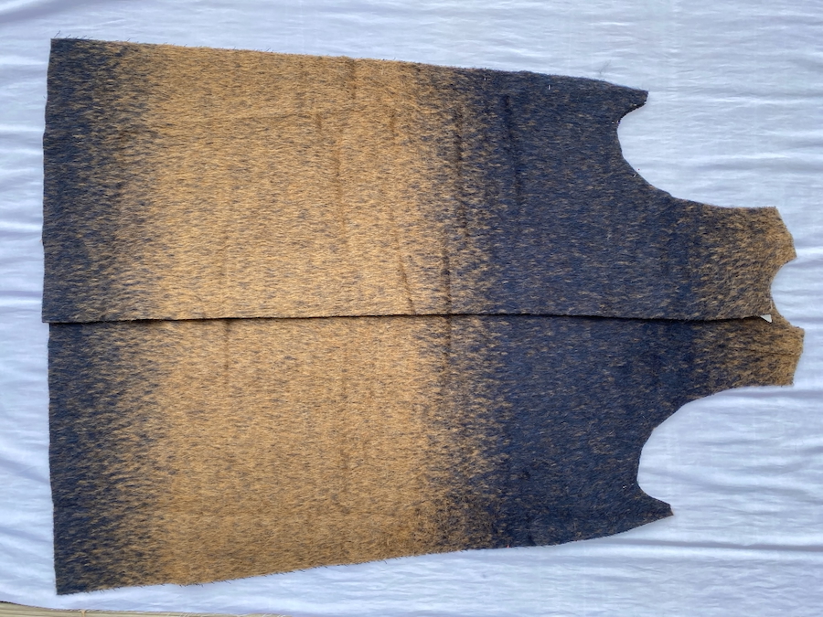 So, jetzt mal ein paar Worte zum Stoff. So ein handelsüblicher flauschiger „fake fur“ mit langen Haaren und gestrickter Rückseite ist er ja nicht. Kein Angorakaninchen, eher Typ Feldhase mit kurzen Haaren und eindeutiger Strichrichtung. Wahrscheinlich ist Wollflausch die richtigere Bezeichnung. Der Stoff ließ sich problemlos mit der Schere zuschneiden! Und die Probe an einem Reststück ergab: er lässt sich sogar bügeln, ohne platt zu werden! Und eine weitere Probe ergab: man kann sogar G785 aufbügeln! Das ist zwar eine ganz leichte Einlage, aber der Unterschied ist spürbar.